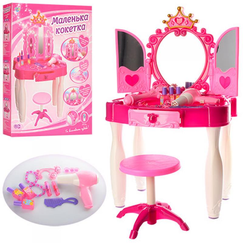 Це чудове, яскраве трюмо ідеально підійде для маленької прінцесси.Трюмо оснащено безпечним декорованим дзеркалом. У висувному шухлядці Ваша донька виявить фен, гребінець, намиста, кільця, шпильки для волосся та ін. Якщо натиснути функціональну клавішу, то дверцята дзеркала повільно відкриються і заграє музика, загориться світло. При натисканні на кнопку включення фен видає реалістичні звуки. У комплект входить 8 предметів. Працює від батарейок (в комплект не входять) .Размер трюмо 40 x 30 x 70 см.