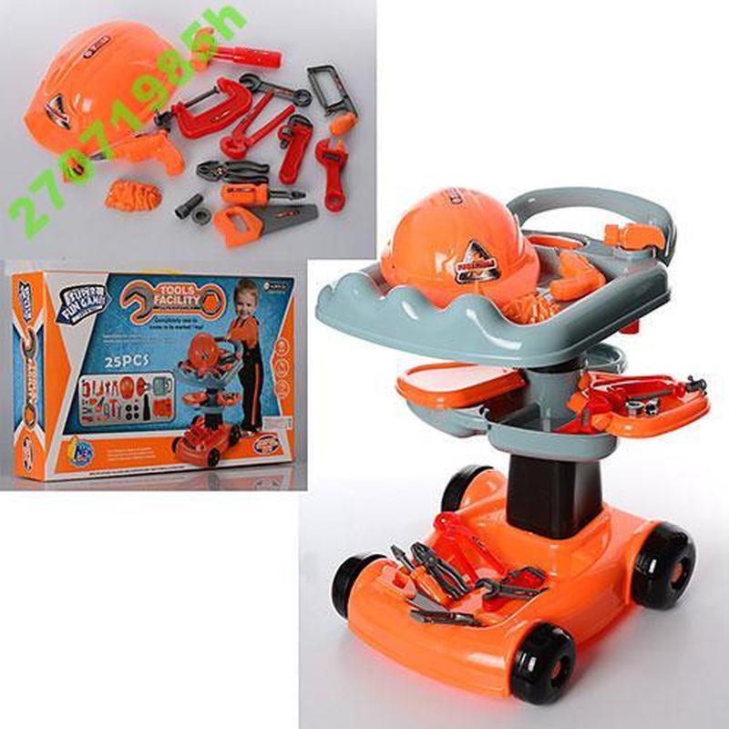 Набор инструментов с тележкой ― замечательный игровой набор инструментов для ролевых игр в столяра и мастера по ремонту, в состав которого входят 25 деталей. В него входит тележка на колесах, отвертка, плоскогубцы, молоток, болтики, гайки, линейка, ключ разводной, ящик для инструментов, наклейки и т.д. Размер коробки: 60-39,5-13см