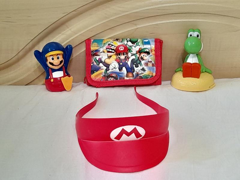 гаманець на липучці - 12х 22 см , козирок пластмасовий -р -50-53 см, маріо інерційний , їздить - 8,0 см , йоші - 9,0 см .ціна за 4 .