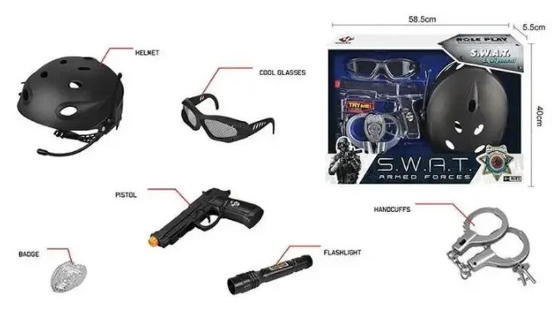 Детский набор полицейского 6 элементов, пистолет на батарейках со звуковыми эффектами, каска, очки, наручники, аксессуары, в коробке, S005B. Долг полицейского - бороться за справедливость и заботиться о безопасности мирных жителей. Кроме смелости и отваги мальчишке понадобится специальная экипировка, которая поможет в нелегком деле. Игровой набор полиции S 005 B - это как раз то, что нужно для Вашего храброго ребенка! Комплектация: - очки; - полицейская каска; - пистолет; - фонарик; - наручники с ключиком; - жетон. При нажатии на курок, пистолет активирует звуковые эффекты выстрела. Пистолет работает от батареек, которые входят в комплект. Размер упаковки: 66 см × 7 см × 35 см Внимание. Производитель оставляет за собой право изменять комплектацию, цветовую гамму и характеристики товара без предварительного уведомления. После оформления заказа мы свяжемся с Вами в течение 2-х часов и если у Вас возникнут вопросы, мы с радостью на них ответим.