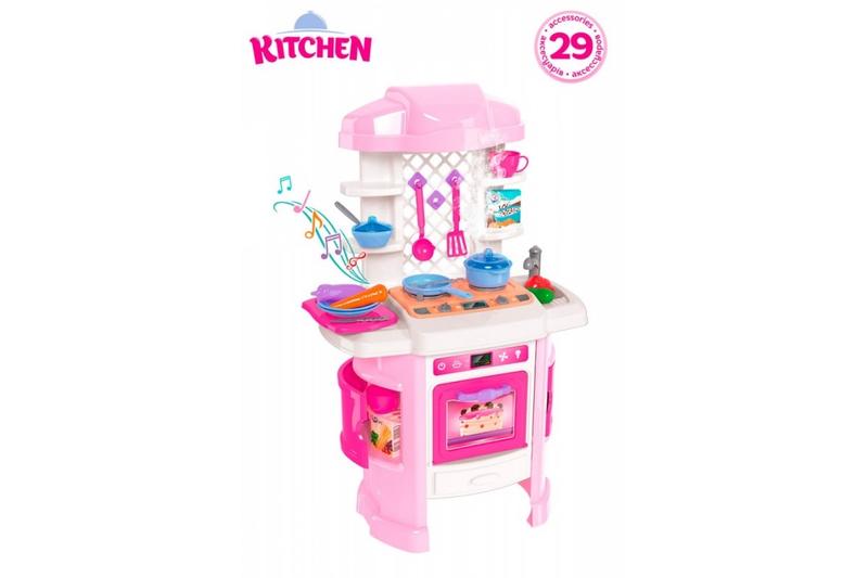 Возраст ребенка-3+ Размеры 81 х 51 х 30 см Вага-3140 г Упаковка-Коблока (61 × 48 × 20 см) Комплектация: игрушечная кухня, варочная панель с электронным модулем, кран, дощечка, кастрюля с крышкой, сковородка, чашка - 2шт., блюдце - 2шт., ложка - 2шт., вилка -2шт., нож - 2шт., тарелка - 2шт., конфета с крышкой, вилка большая, шавка, лопатка, черпак, огурц, морковь, баклажан, помидор, коробочка - 2шт, губка.