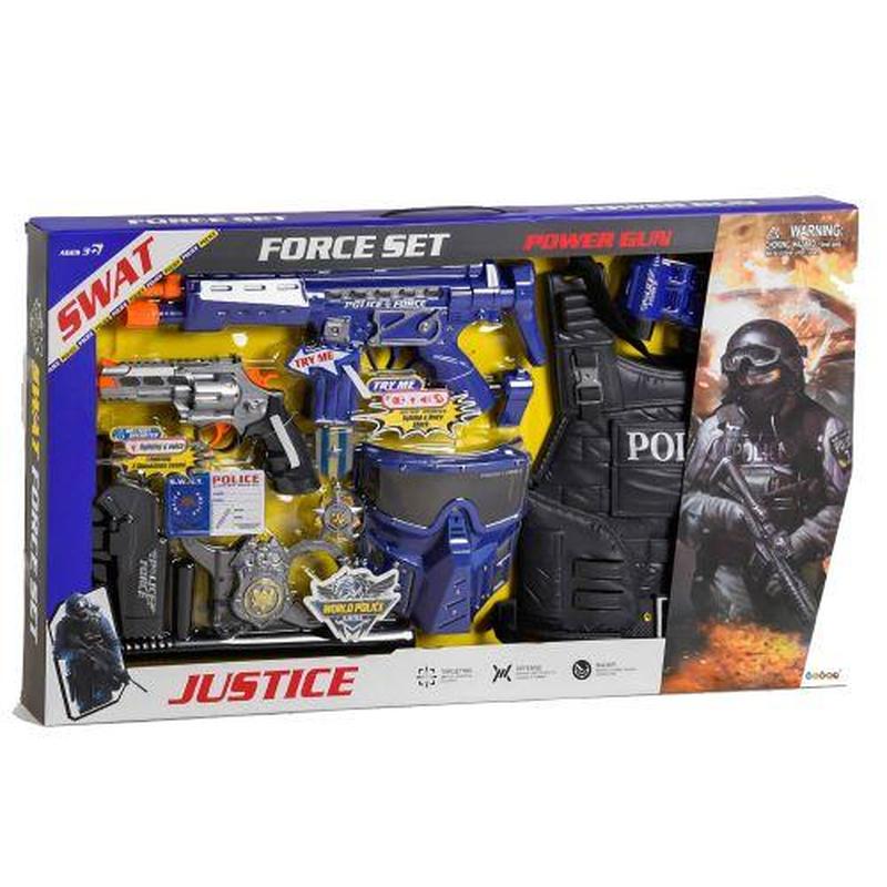 Игровой набор "Полиция". В комплекте есть: автомат, пистолет, бронежилет, маска с защитными очками, удостоверение, кобура, дубинка, бинокль, нож, медаль. У автомата и пистолета есть световые и звуковые эффекты: светится корпус, звук стрельбы. Выполнено из качественного и прочного пластика.