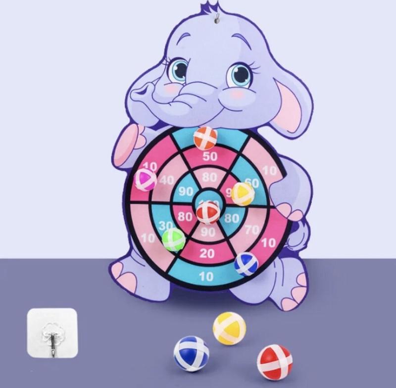Яркий игровой набор. Данная модель позволяет разыгрывать интересные сюжеты и устраивать настоящие соревнования. Есть белочка, обезьянка, слоненок на броне. Цена за 1941. Особенности: - современный дизайн; - 3 пластиковых мячиков на липучках +1 в подарок - крючок для подвешивания.