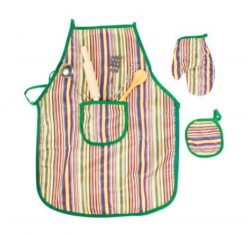 Набор шеф-повар. Очень качественный набор для юного шеф-повара включает в себя: тканевый фартук, 2 прихватки, деревянную скалку и ложку, металлический венчик, лопатку и половник.