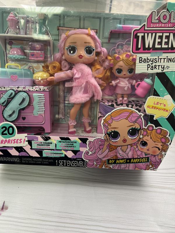 OL Surprise Tweens Babysitting Sleepover Party Новая серия няни LoL Tweens является набор из двух кукол и 20 аксессуаров. Есть МАЛЕНЬКА ТРЕЩИНА НА УПАКОВЦЕ 0 ЛОЛ твинс Айви Винс имеет исключительную красоту. Особое внимание привлекают ее к долгому вьющиеся желто-розовые волосы. Девушка готова к пижамной вечеринке - в розовом атласному халату и туфлям на высоком каблуке. Айви Винс ухаживает за младшей сестру Бебидолла. Кукла имеет несколько точек артикуляции, благодаря чему может принимать множество поз за помощью человека. В набор L.O.L. Surprise Tweens Babysitting Sleepover Party Включено: кукла Л.О.Л. Подлок - Айви Винс куколка Л.О.Л. - Бебидолл расческа полотенце 2 повязки миска попкорну бутылка Зубна паста 2 зубные щетки одежда косметика Десерт Упаковка продукта может быть фоном для игры. ВОЗРАСТ: 3+