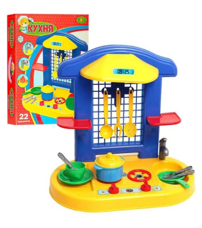 Набор игрушечной посуды с плитой и раковиной, стенкой и полками для посуды. В комплект входит сковородка, кастрюля, 2 тарелки, 2 чашки, столовые приборы. Размер кухни: 48×40×30 см.