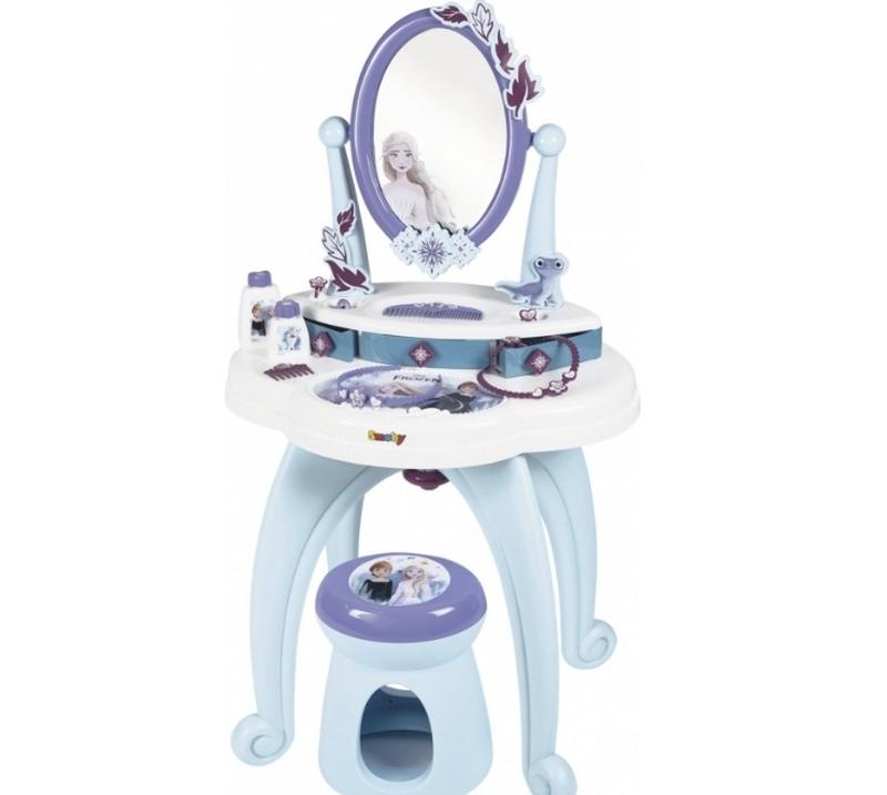 Детский игровой набор Smoby Toys Столик с зеркалом Фроузен Парукмерская 2 в 1 - станет настоящим уголком красоты для настоящей принцессы. Он оформлен за мотивами любимого мультфильма и украшен героями из Frozen. Столик-трюмо со съемной верхней частью, можно ее снять, и поставить для игры куда завгодно. Трюмо дополнено выдвижными ящиками, вращающимся зеркалом. Возле зеркала расположены выдвижные ящики и полочки, в которых удобно хранить украшения. - Красивый дизайн в стиле любимого мультфильма - съемная верхняя часть трюмо - вращающееся зеркало - украшения в комплекте: 2 расчески для волос, обруч для волос, 2 флакончика, 3 кольца, браслет - удобный стульчик - качественные материалы Размеры: 49 х 19 х 64 см Материал: пластик Производитель: Smoby Toys, Франция. Для детей от 3-х лет.