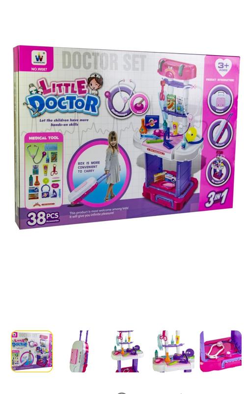 Отличным подарком для Вашей маленькой дочки или сына, желающих играть в доктора. Игровой комплект подходит для сюжетно-ролевой игры. Девочка сможет поиграть в поликлинике или даже рекомендованию, поликовать своих куколок и животных. Набор доктора раскладывается в тележку со столиком и полками, где можно расположить все аксессуары и лекарства. Тележка оснащена колесиками для удобного передвижения. Тележка трансформируется в удобный чемоданчик, куда после игры можно сложить все вещи маленького доктора. В комплекте 38 предметов: коробочка для таблеток, флакончики для микстуры, микроскоп для проверки анализов, термометр для измерения температуры больного, шприц для инъекций, очки для солидности доктора, стетоскоп и молоточки со звуковыми эффектами. Все предметы игры выполнены из яркого цветного полимера высокого качества. Материал антиаллергенный, безопасный для малышей.