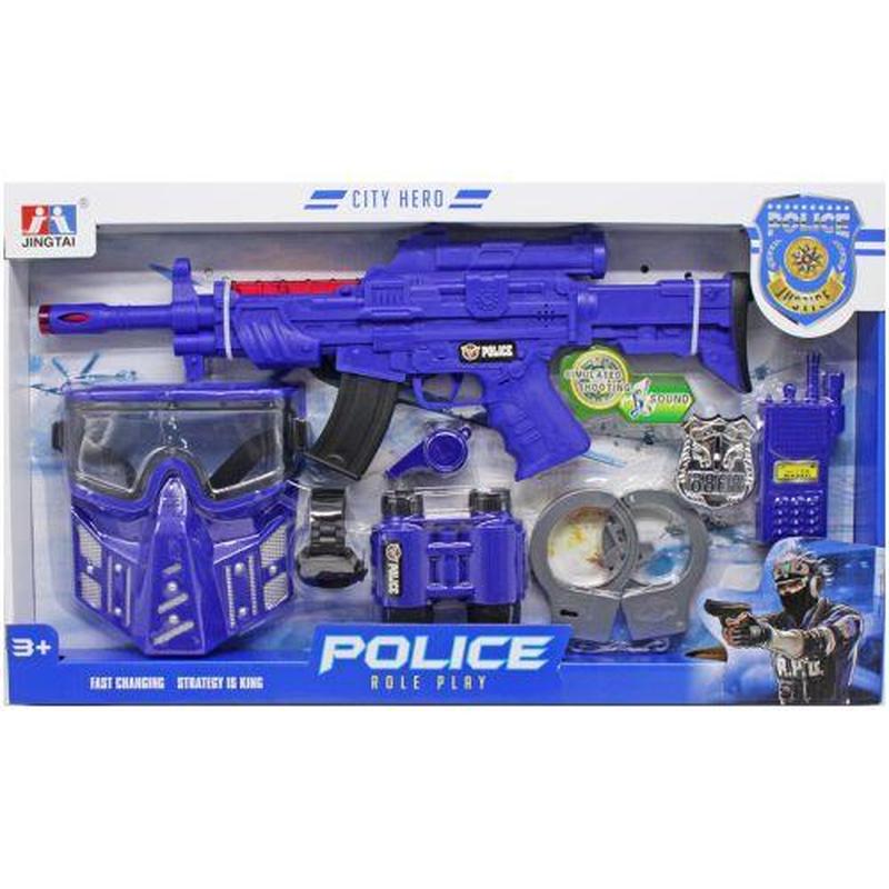Большой игровой полицейский набор для увлекательных сюжено-ролевых игр. В комплекте есть автомат со световыми и звуковыми эффектами (длина - 43 см), защитная маска (размер - 15х16 см), наручные часы, бинокль, свисток, наручники. полицейский жетон, рация. Набор выполнен из прочного пластика. Бренд: JINGTAI Упаковка: Коробка Цвет: Синий Вес в упаковке: 575 г Габариты в упаковке: 5.5 x 53 x 30 см Габариты без упаковки: 3 x 43 x 15 см Cтрана производитель: Китай Материал: Пластик Комплектация: Автомат, маска, расы, свисток, наручники, полицейский жетон, рация