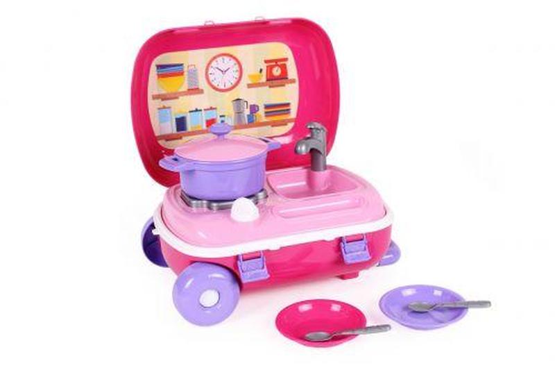 Игрушечная кухня с посудой в ярком розовом чемодане. Чемодан имеет большие крепкие колеса, удобную ручку, что регулируется и надежные защелки. Трансформируется в маленьку кухню с плитой, краном и посудой._ Бренд: ТехноК Упаковка: Чемодан Цвет: Розовый Тип эл-тов питания: Нет Эл-ты питания в комплекте: Нет Вес в упаковке: 965 г Габариты в упаковке: 34 x 24 x 17 см Cтрана производитель: Украина Материал: Пластик Комплектация: Чемодан, кухня, посуда