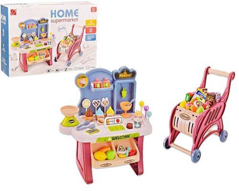 Игровой набор "Супермаркет" будет хорошим подарком ребенку. Имеет звуковые и световые эффекты (подсветка кассы и звук пиканья как в настоящей кассе). Касса работает от 3-х батареек типа АА (в комплект не входят). В наборе есть: стойка-магазин; кредитная карта; мороженое; леденцы; фастфуд; шоколадные конфеты; сок; игрушечная еда. Размер конструкции - 37х38,5х20 см., тележки - 30х29,5х17,5 см. Выполнен из качественного пластика. Для детей от 3-х лет.