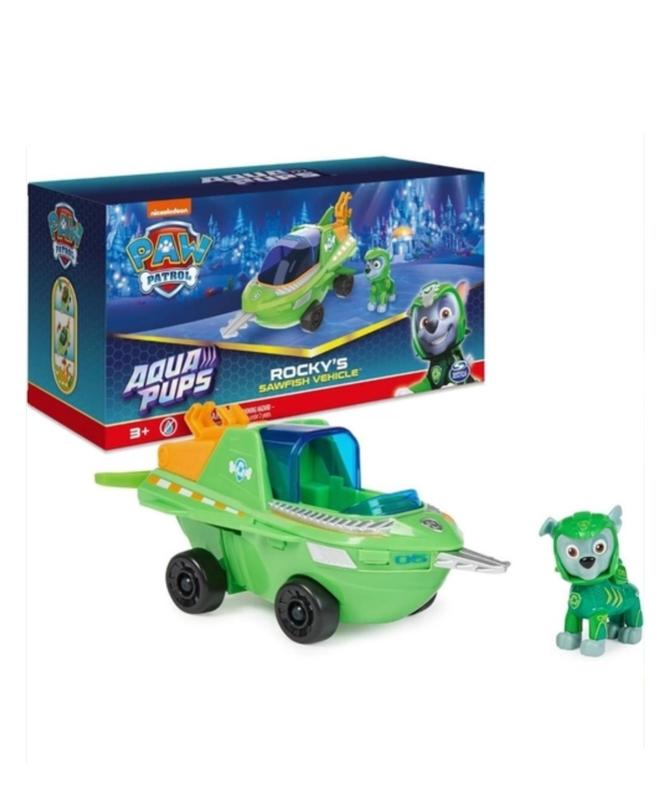 Paw Patrol Aqua Pups Rocky Transforming Sawfish Vehicle Объединитесь с Рокки и примите участие в увлекательных спасательных операциях на его машине Aqua Pups Rocky Transforming Sawfish. Одетый в зеленый гидрокостюм и шлем Aqua Pups, Рокки готов к экстренным спасательным операциям в море. Автомобиль рыба-пила Рокки демонстрирует захватывающую трансформацию. Просто поместите Рокки в автомобиль и закройте кабину, чтобы задействовать крылья и спинной плавник, переводя его машину в режим спасения. Если возникнет преграда, используйте пилу и хвост манипулятор. Создавайте захватывающие приключения с помощью спасательной машины Рокки.