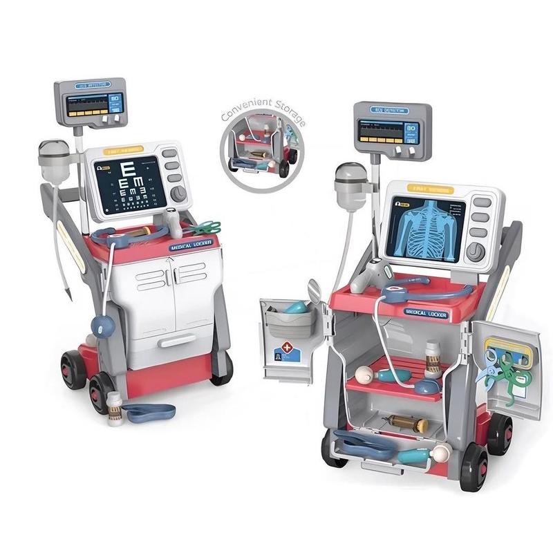 Данный набор поможет обустроить полноценный лекарственный кабинет и состоит из тележки с медицинскими приборами, инструментами и лекарствами. На мониторе размещенному над столиком предусмотрена возможность изменения вкладыша (рентген разных частей тела, офтальмологическая таблица), а также звуки – звук биения сердца и экстренный сигнал. Стетоскоп с звуками сердцебиения (работает от батареек, входящих в комплект). Тележка легко передвигается, так как она оснащена колесами и ручкой. Также предусмотрен вместительный шкаф для хранения игровых аксессуаров. Отправляем по Новой почте по всей Украине НАШИЕ ПРЕИМУЩЕСТВА: 1. Перед отправкой РЕТЕЛЬНАЯ проверка на наличие заводского брака. 2. Никаких царапин и отсутствуют детали и др. 3. Гарантирую упаковку товара, обеспечивая целостность и сохранение товарного вида