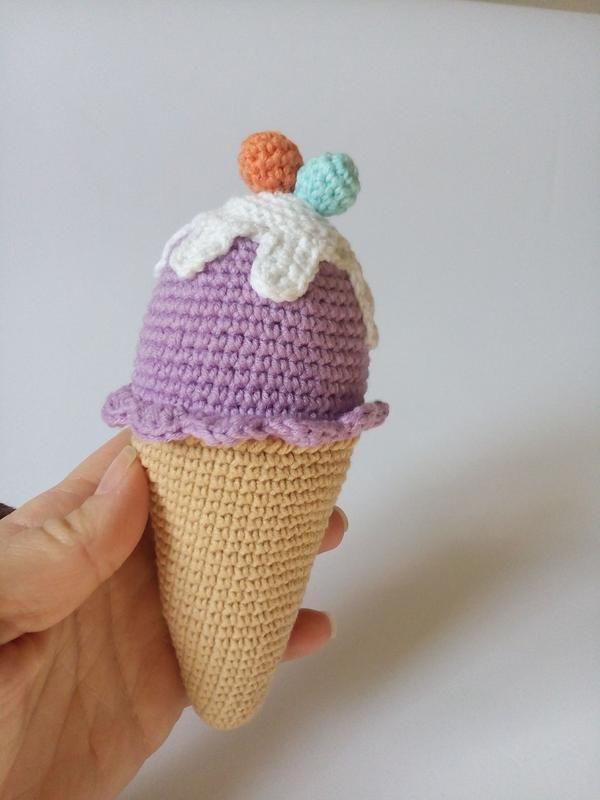 Морозиво ріжок зв'язане гачком з якісної полухлопоковой пряжі. Всередині холопфайбер. Довжина морозива до ягідки 13 см, з ягідкою 15 див. Ціна за 1 шт. Під замовлення можливі інші варіанти (термін виконання 2 дні)