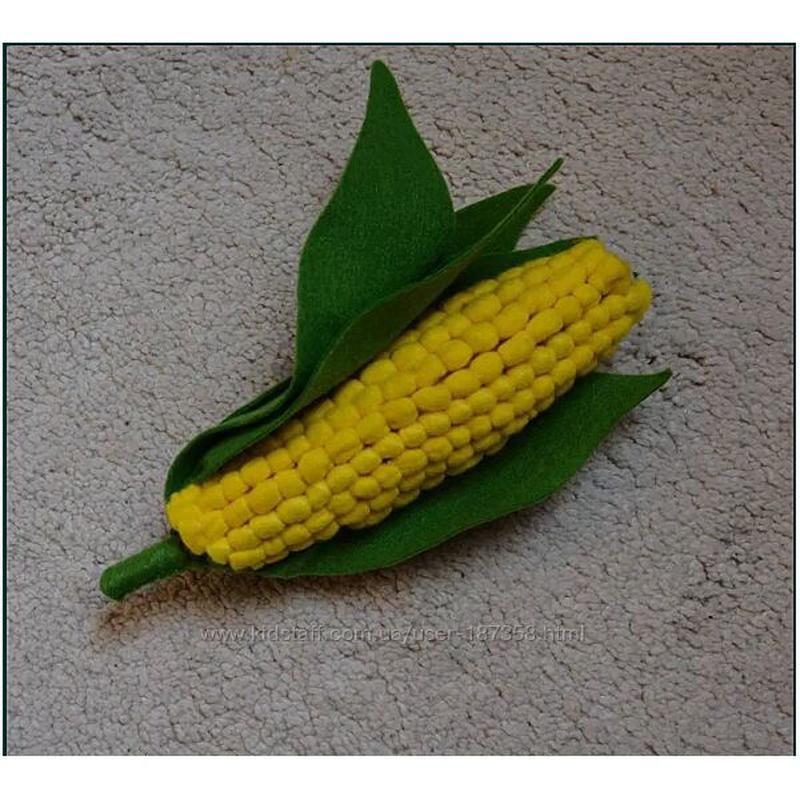 Кукурудза з фетру. Довжина 19 см. Граючи з такими іграшками, дитина розвиває інтерес до кулінарії, вивчає види овочів, вигадує сюжети для рольових ігор та поповнює словниковий запас. Можливо пошиття всіх видів овочів та фруктів, виготовлення набору. Товар виготовляється на замовлення