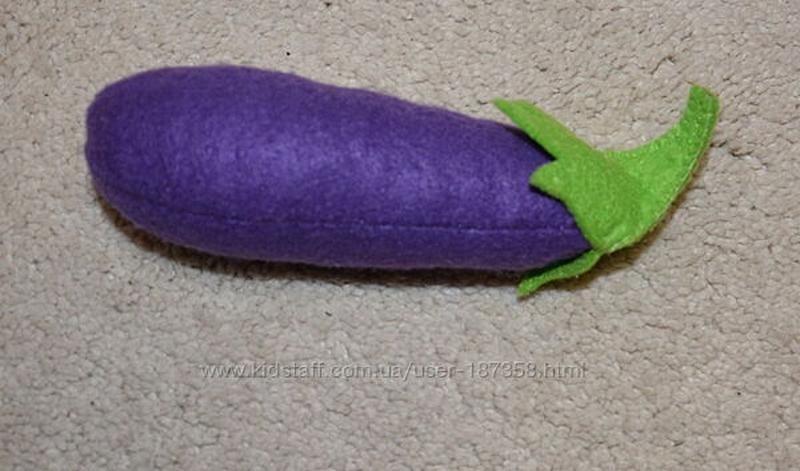 Баклажан – размер 15 см Х5 см Граючи з такими іграшками, дитина розвиває інтерес до кулінарії, вивчає види овочів, вигадує сюжети для рольових ігор та поповнює словниковий запас. Можливо пошиття всіх видів овочів та фруктів, виготовлення набору. Товар виготовляється на замовлення