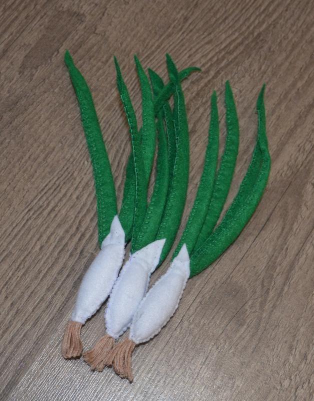 Цибуля зелена. Пучок з 3-х цибулинок. Довжина 23 см. Можлива інша кількість. Граючи з такими іграшками, дитина розвиває інтерес до кулінарії, вивчає види овочів, вигадує сюжети для рольових ігор та поповнює словниковий запас. Можливо пошиття всіх видів овочів та фруктів, виготовлення набору. Товар виготовляється на замовлення