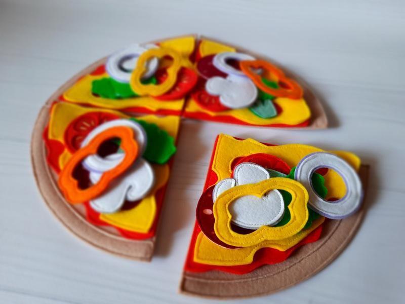 Їжа з фетру. Гра ручної роботи - Піца з фетру. Діаметр піци - 26см. Поділена на 4 шматочки. 8 начинок. Набір: шматочки піци - 4шт кетчупа - 4шт шматочки сира - 4шт пепероні - 4шт цибульки - 4шт перець - 4шт броколі - 4шт гриби - 4шт Всі елементи БЕЗ магнітів та БЕЗ липучок, що дозволяє складати начинки в довільному порядку :) ! Можна заміняти чи додавати начинки за бажанням ! При замовленні просто напишіть в коментарі, якщо ви бажаєте щось прибрати/додати. Я звяжусь з вами та обговоримо всі деталі :) При додаванні начинок ціна перераховується. Товар виготовляється на замовлення