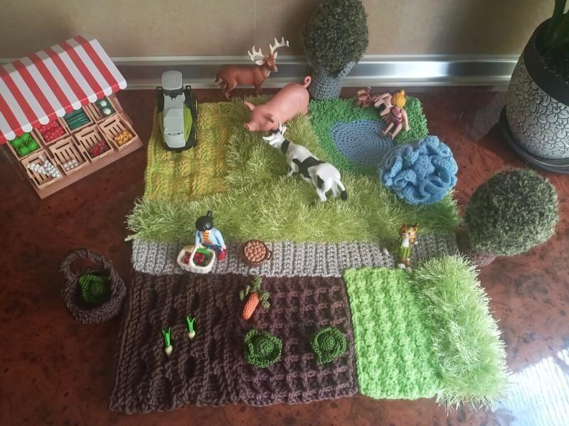 Фактурный коврик ручной работы на фетре. Размер 40×40. 2 фактурных грядки для игры в "огород" с полимерными или другими овощами. Маленькое озеро не пришито. Связано в технике гиперболического вязания. В него можно прятать рыбку, ловить как мяч/снежок. В комплект входит маленькое дерево, капуста и корзинка. Можно на нем рассказывать сказки маленьким деткам и наоборот быть зрителем " кукольного театра" у тодлеров. Отлично подходит для игры с любыми мелкими игрушками человечками (типа playmobil), животными (лес, ферма), машинками, с полимерными овощами, "рыбалка" и т.д. Дополнительные характеристики: Пол: Унисекс