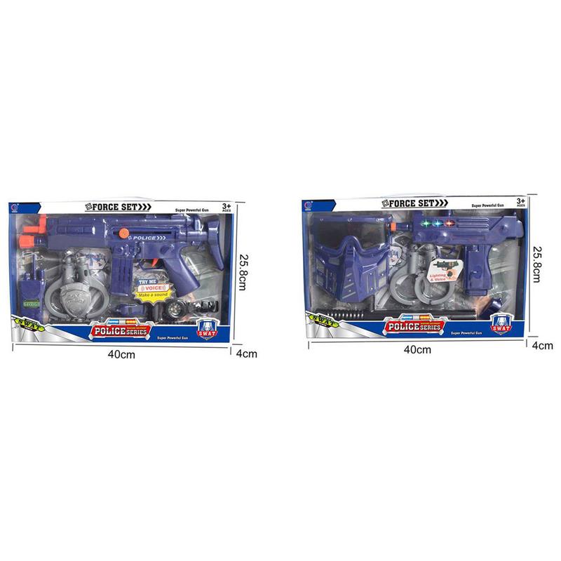 набор полиция от 5 предметов звук свет 2 вида на батарейках (в набор не входят) Материал - пластмасса Упаковано в коробку Размер коробки - 41-25,5-4см Китай