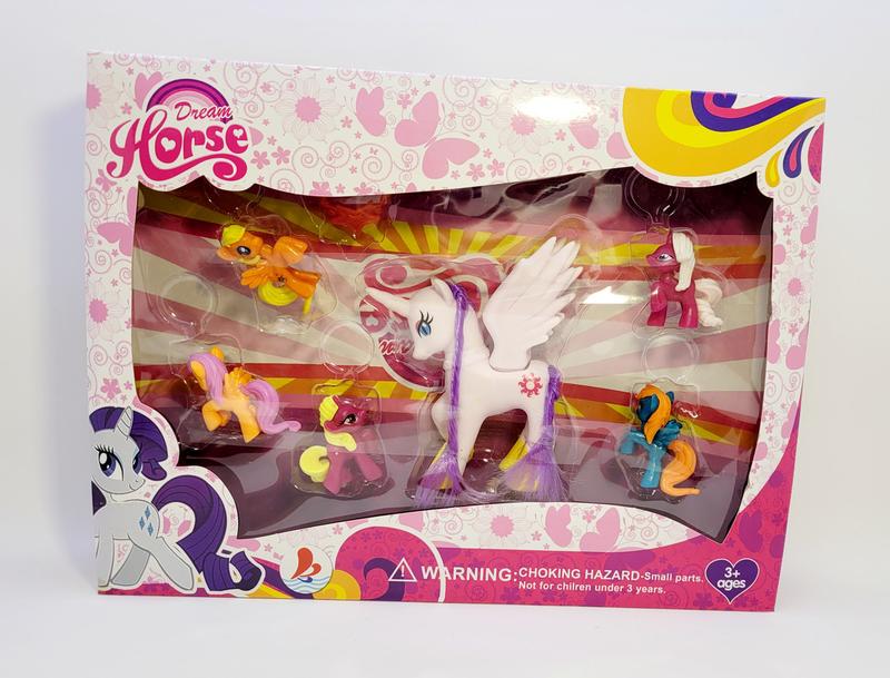 від 3 років 5шт міні поні 1 аксесуар 1 середня поні Розмір міні поні - 5 см Розмір середньої поні - 12 см по крила Матеріал - полімерний Запаковано в коробку Розмір коробки - 25,5х35х5 см Китай