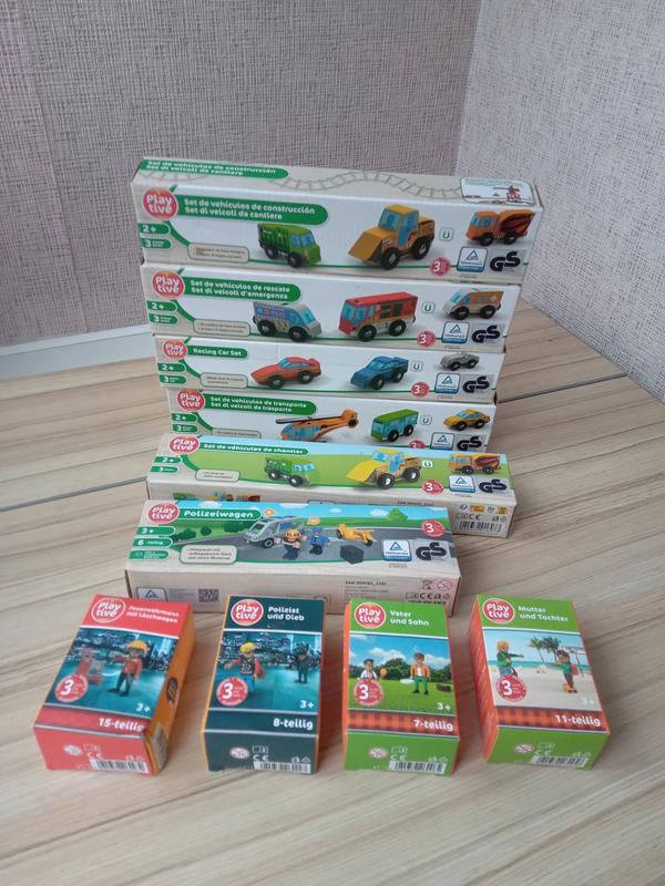 1) Набор деревянных машинок от немецкого бренда PlayTive. Изготовлены из древесины европейского бука. Все автомобили с магнитной муфтой Возрастная рекомендация: от 2 лет Материал: Дерево/металл/пластик Может комбинироваться с другими поездами и транспортными средствами от Playtive Совместим со стандартными деревянными рельсами и деревянными дорогами и т.д. Соответствует стандартам сертификатов TUV, GS. Размер упаковки: 29 х 6 х 4 см Страна производитель: Германия. Цена: по 200 . Набор фигурок Playtive. Высота фигурок 7,5 см. Количество деталей от 7 до 15. Материал пластик. Цена: по 100 . 3) Полицейская машина Playtive с фигурками, на батарейках. Яркие цвета и продуманные детали заинтересуют вашего ребенка и сделают его игру более увлекательной. Характеристика: - сочетается с наборами игровых треков и транспортных средств - качественный пластик - идеально разработанные детали. Содержимое: полицейская машина со съемной крышей, фигурка полицейского, преступник в наручниках, мотор и мотоцикл. 6 элементов Размер: полицейская машина - 11 х 3,2 х 5,2 см; каждая фигурка: 4,5 см. В наличии 1 шт Цена: 300