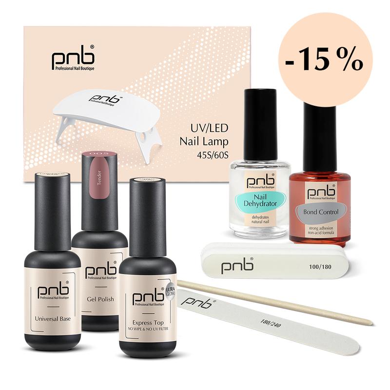 UV/LED Mini Lamp PNB 6W, UV/LED Universal Base PNB, 8 мл, UV/LED Express Top PNB, 8 мл, Nail Dehydrator PNB, 15 мл, Bond Control PNB, 15 мл, UV/LED Gel Polish PNB 005, 8 мл, індивідуальний набір для манікюру PNB зі знижкою 15%. Якщо й існує ідеальний манікюрний набір на всі випадки життя – то це гарантовано набір «Універсальний» від PNB. Все, про що тільки можна мріяти сучасній модниці в одному місці – від міні лампи до стильного гель-лаку! Набір включає: - UV/LED Mini Lamp 6W PNB – ця чудо-помічниця: стане альтернативним апаратом для полімеризації у випадку несправності основної лампи; майже невідчутна за вагою; є гарантією лояльності Ваших клієнтів, адже не доведеться переносити записи; на випадок відключення світла Ви можете працювати цією лампою у парі з павербанком; можна брати з собою у поїздки. Розмір лампи 131x67x19 мм; колір 一 білий; основний матеріал пластик. В комплект входять: лампа, USB кабель, адаптер, інструкція. - UV/LED Universal Base PNB, 8 мл – це must have для довговічного манікюру, що протримається до 28 днів! Застосовується для поліпшення адгезії, ідеальна навіть для нігтів з вологою нігтьовою пластиною. Сприяє неймовірному зчепленню штучного матеріалу й натурального нігтя, перешкоджає виникненню відшарувань. Забезпечує більш ефективне зчеплення з кольоровим гель-лаком та з матеріалами для моделювання. - UV/LED Express Top PNB, 8 мл – фінішне покриття для гель-лаку без липкого шару. Лягає тонко, не додаючи зайвої товщини нігтьовій пластині. Вирізняється еластичністю, швидким висиханням та неймовірним ефектом «мокрого» блиску. Підходить для нанесення втирок. Не має UV-фільтрів. - Nail Dehydrator PNB, 15 мл – засіб для підготовки нігтів перед нанесенням будь-яких систем для моделювання чи декорування нігтів. Формула продукту сприяє вирівнюванню pH-рівня нігтя, а також усуває залишки шкірного жиру і забруднень з поверхні натуральної нігтьової пластини, збільшує стійкість та міцність манікюру і педикюру. Вирізняється безпечною формулою, рівномірним покриттям та моментальним всмоктуванням. - Bond Control PNB, 15 мл – адгезивне безкислотне грунтове покриття. Унікальний безкислотний засіб, що забезпечує надміцну адгезію будь-яких гелевих продуктів, у тому числі й гелевих лаків. Запобігає відшаровуванню, сприяє кращому поєднанню штучного покриття з кератиновою структурою нігтьової пластини. Вирізняється легкістю застосування та відмінним знежиренням поверхні. - UV/LED Gel Polish PNB 005, 8 мл – напівпрозорий відтінок допоможе створити ніжний та одночасно загадковий образ. Він чудово підходить для використання в якості основи для відомого французького манікюру. Також можна почати експериментувати з додаванням декоративних камінців. Індивідуальний набір для манікюру PNB – набір найнеобхідніших матеріалів для манікюру, який забезпечує комфорт та безпеку клієнта. Обов'язково після роботи з бафом pnb і пилкою обробити їх спеціальними засобами, щоб уникнути зараження. Потім просушити матеріали і зберігати в крафт-пакеті до наступної роботи з клієнтом. Набір можна використовувати багаторазово для одного клієнта, розрахований до 6-ти місяців використання, якщо виходити з розрахунку – два манікюри в місяць. У наборі включені: міні-пилка абразивністю 180 і 240 гріт, баф 100 і 180 гріт і середня апельсинова паличка. Вас здивує не тільки наповнення цього набору, а й вигідна ціна з приємною знижкою 15%! Замовляйте набір «Універсальний» прямо зараз, щоб забезпечити міцне 