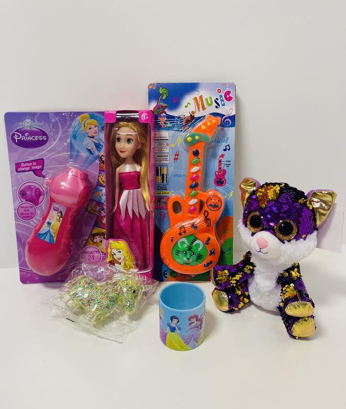 Набір іграшок для дівчинки, складається із 6 позицій: - Лялька "PRINCESS DISNEY/ Принцеса Діснея", 23 см, у коробці 24.5*6*4.5 см - Проєктор ліхтарик "Мультгерої", 17 см, проєктор, 24 картинки, світиться, на батарейках, на планшетці 25*15.5*4.5 см - Пострибунчик Антистрес "Єдиноріг", 7*4.5 см, з наповнювачем блискітки, світиться - М'яка іграшка Вдивляйко "Собачка", 20 см, паєтки - Пружина DISNEY/Дисней - Музична гітара, 25 см, музика, на батарейках, на планшетці 28 см