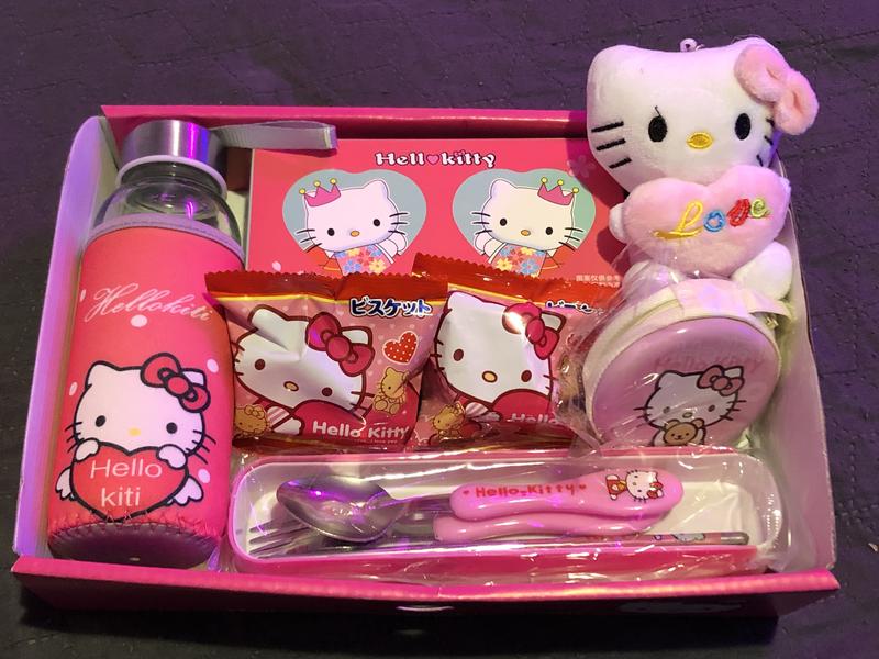 що входить: • пляшка з чохлом •набір з виделки, ложки і паличок • два печива • десерт • іграшка брелок з hello kitty маєш питання? пиши в особисті!