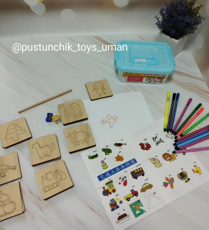 Для творчества и развития воображения вашего ребенка. В наборе разные виды трафаретов: транспорт, природа, люди, животные, жители водоемов, птицы, фрукты и др. Также можно разрисовать деревянные серединки. Присутственная книжечка с образцами. В наборе: 24 штуки деревянных трафаретов, 12 фломастеров, 1 карандаш, 1 точилка, 1 стирачка, альбом для рисования, пазл на 16 элементов и схема. Все хранится в удобном лоточке. Рекомендуемый возраст 4+роков. Смотрите другие Мои объявления, подписывайтесь, имею регулярные обновления детской, женской одежды и обуви, и игрушек. Постоянным покупателям скидка 5%. При заказе от 500 грн бесплатно доставка вкрпоште.