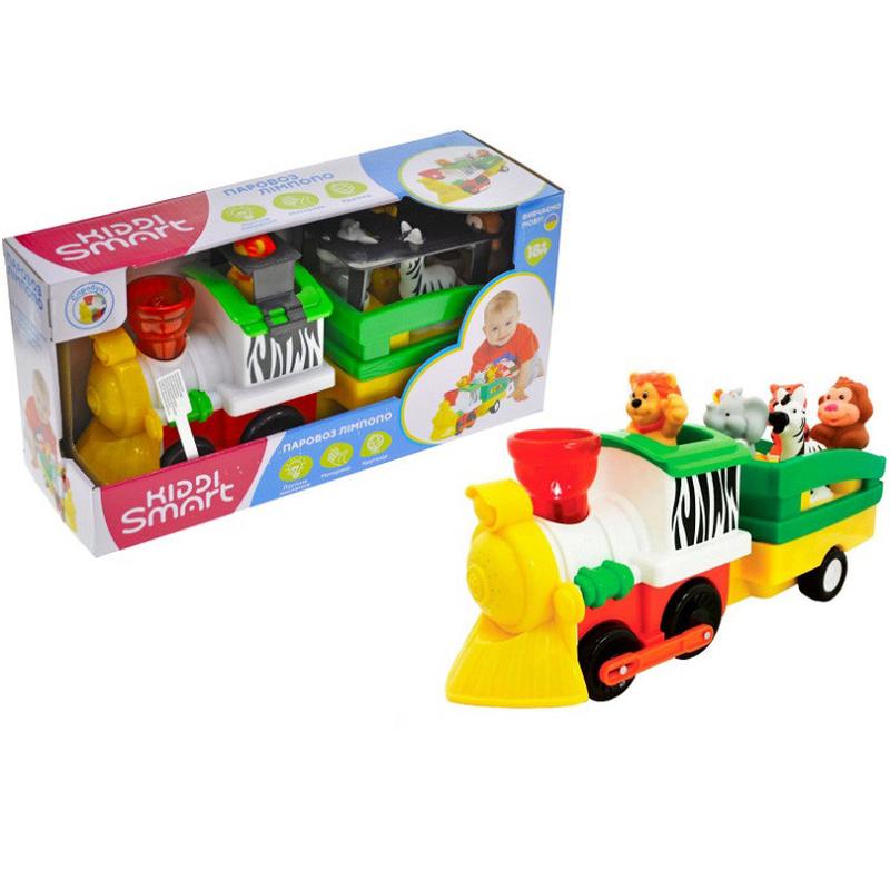 Игровой набор Паровоз Лимпопо озвученный на украинском языке развлечет малыша мигающими огоньками, веселой музыкой, звуками животных и познакомит с обитателями джунглей. При нажатии на трубу Паровоз едет вперед, при этом из трубы звучит задорное Ту-туууу!, звучат реалистичные звуки стука колес и тормозов. В Паровозе находятся 6 фигурок диких животных, которые по форме ножек ставятся на свои места по принципу сортера. Если фигурку правильно поставить на свое место, при нажатии она издает соответствующий реалистичный звук, рассказывает стишок, а Лев-машинист поет песенку. Отправляйтесь в веселую и познавательную поездку! Работает от 3 батареек типа АА (входят в комплект). Размер коробки 36 * 12 * 18 см.