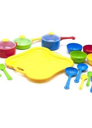 Набор яркой пластиковой посудки "Ромашка". В комплекте: поднос (29 х 29 см), кастрюлька с крышечкой, сковородка с крышечкой, кастрюлька с ручкой и крышечкой, 4 прибора для готовки, 4 тарелки и 4 ложечки. Бренд: TIGRES Упаковка: Сетка Цвет: Разноцвет Вес в упаковке: 440 г Габариты в упаковке: 29 x 29 x 9 см Габариты без упаковки: 29 x 9 см Cтрана производитель: Украина Материал: Пластик Комплектация: Поднос, кастрюлька с крышечкой, сковородка с крышечкой, кастрюлька с ручкой и крышечкой, 4 прибора для готовки, 4 тарелки, 4 ложечки