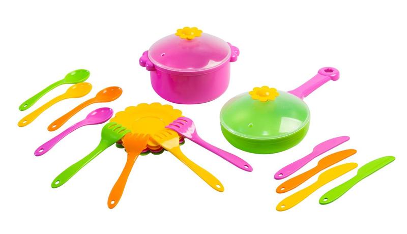 Набор игрушечной посуды столовый Ромашка из 20 элементов поможет будущей хозяйке приготовить вкусный обед с помощью кастрюли и сковородки, а потом - красиво и аппетитно его подать гостям с помощью тарелок, ложек, вилок и ножей. Ромашковый дизайн делает набор еще более интересным и привлекательным. Ручка со сковородки снимается, превращая ее в удобное блюдо для выпечки. Игрушечная посудка Ромашка от Тигрес создана из безопасной пищевой пластмассы. Она может использоваться в микроволновой печи и посудомоечной машине. Набор доступен в одной цветовой комбинации: розовый-желтый-зеленый-оранжевый. Состоит из 20 элементов. Упаковка - сетка.