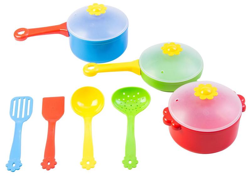 Набір іграшкового посуду столовий "Ромашка" з 10 елементів дасть можливість будь-якій дівчинці відчути себе шеф-кухарем. За допомогою сковорідок 2 різновидів, каструлі, двох лопаток, шумівки та ополоника вона зможе приготувати справжній бенкет. Ручка зі сковорідки знімається, перетворюючи її на зручну страву для випічки. Іграшковий посуд ТМ Тигрес виготовляється з якісної, міцної та безпечної пластмаси. Вона підходить до використання в мікрохвильовій печі та посудомийній машині. Набір доступний у таких колірних комбінаціях: зелений-червоний-синій-жовтий; рожевий-бірюзовий-жовтогарячий- фіолетовий. Складається з 10 елементів: половник - 1шт. каструля — 1 шт. сковорода — 1 шт. сковорода глибока — 1 шт. лопатка кухонна — 1 шт. лопатка кухонна з прорізами — 1 шт. шумівка — 1 шт. кришка — 3 шт. Паковання — сітка.