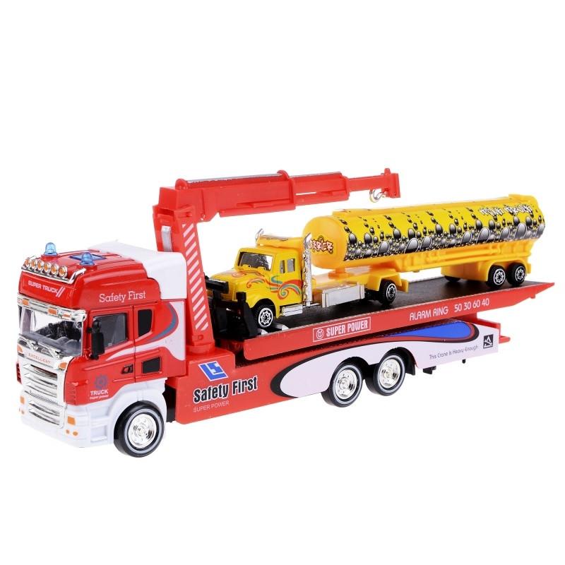 Вантажний трейлер, що перевозить на собі бензовоз. Бензовоз знаходиться на відкритій платформі і для надійності тримається за допомогою гачка. Сама ж платформа може переміщатися далі або ближче від кабіни. Вантажівка має інерційний механізм, під час руху видає звуки і світить різними вогнями. Підійде для різних ігор вдома і на вулиці. Іграшка виготовлена з безпечних матеріалів, призначена для дітей від трьох років. Транспорт – це улюблені всіма іграшки. За допомогою моделей, дитина знайомиться з різними видами транспорту, розширюючи свій світогляд.
