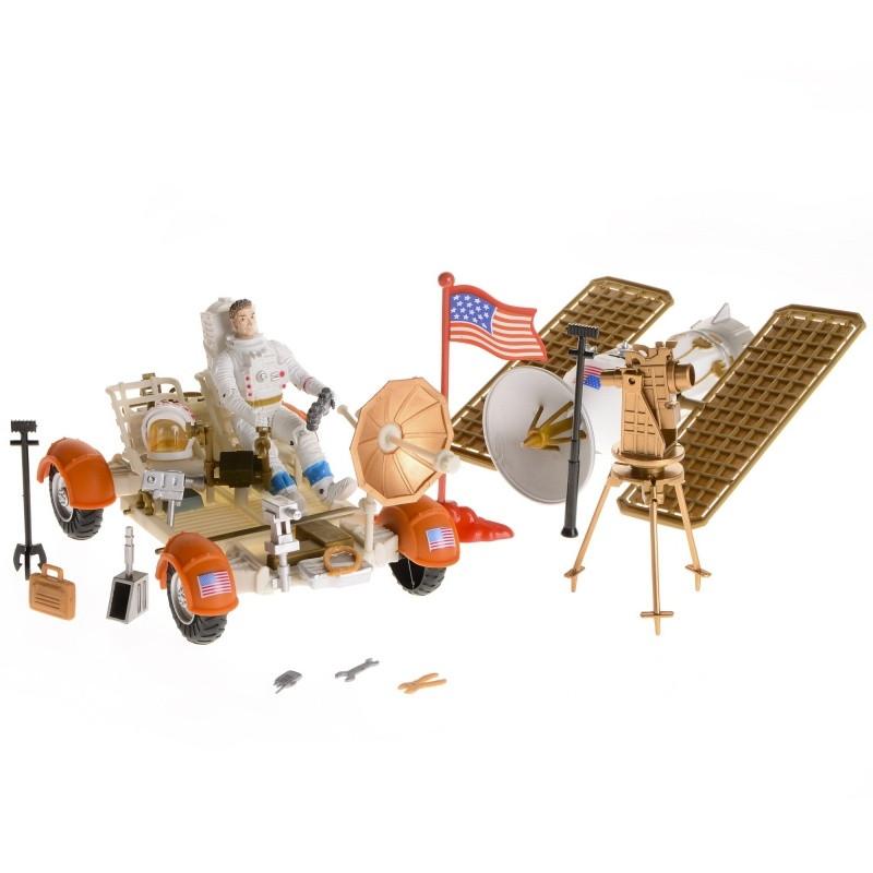 Набір для справжньої космічної пригоди. У комплект входять: місячний всюдихід, космічний супутник, астронавт і прапор з-підставкою. Також включені деякі дрібні аксесуари. Тепер сміливо можна відправлятися досліджувати далекі світи і відкривати нові планети. А після відкриття засновувати там життя, відчувши себе повелителем всесвіту. Та хіба мало що ще можна придумати? Фантастика – найпопулярніший сучасний жанр, який однаково подобається і дорослим, і дітям. Фігурки часто мають дрібні деталі в декорі, що сприяє розвитку дрібної моторики у дитини. Набір виготовлений з екологічно чистого пластику, рекомендується для гри дітям від 3 років.