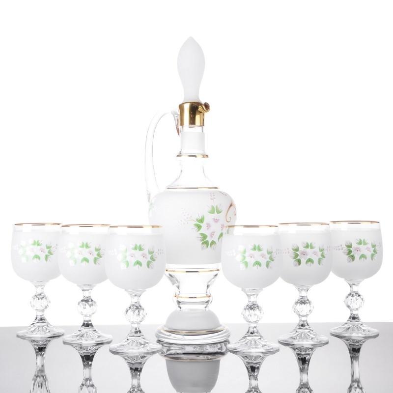 Набір для води Мілле виготовлений з якісного богемського скла, яке відрізняється витонченістю і чистотою. Він складається з одного графина і шести келихів білого кольору. Вони декоровані золотистою облямівкою і квітами в біло-рожевих тонах. Графин має зручну ручку і спеціальну пробку для захисту напою. Вишуканий набір прикрасить ваш святковий стіл. Він створить навколо теплу атмосферу і доповнить інтер'єр. Набір потрібно мити вручну з мийним засобом без абразивних порошків, які можуть залишити на поверхні подряпини. Набір для води стане чудовим подарунком для поціновувачів якісного посуду і затишного відпочинку. Графин досить місткий, але має компактні розміри: висота його - 31 см, діаметр - 10 см.