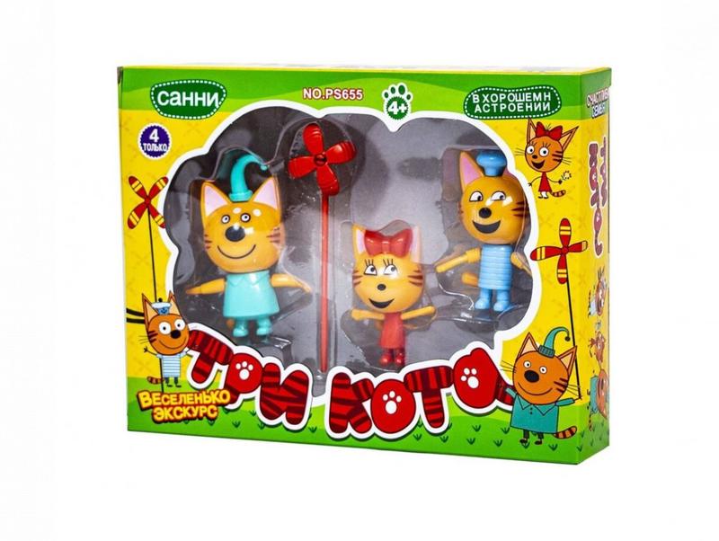 Три коти - фігурки героїв однойменного мультфільму. У комплекті є три головних персонажа: Карамелька, Коржик і Компот. Іграшки виконані з якісного пластика, який не має характерного запаху і є безпечним для здоров'я. Поверхня пофарбована в яскраві кольори, мордочки максимально наближені до того, як виглядають кошенята в мультику. Голова і руки не рухаються. Фігурки упаковані в яскраву коробку, яка підійде і як подарункова.
