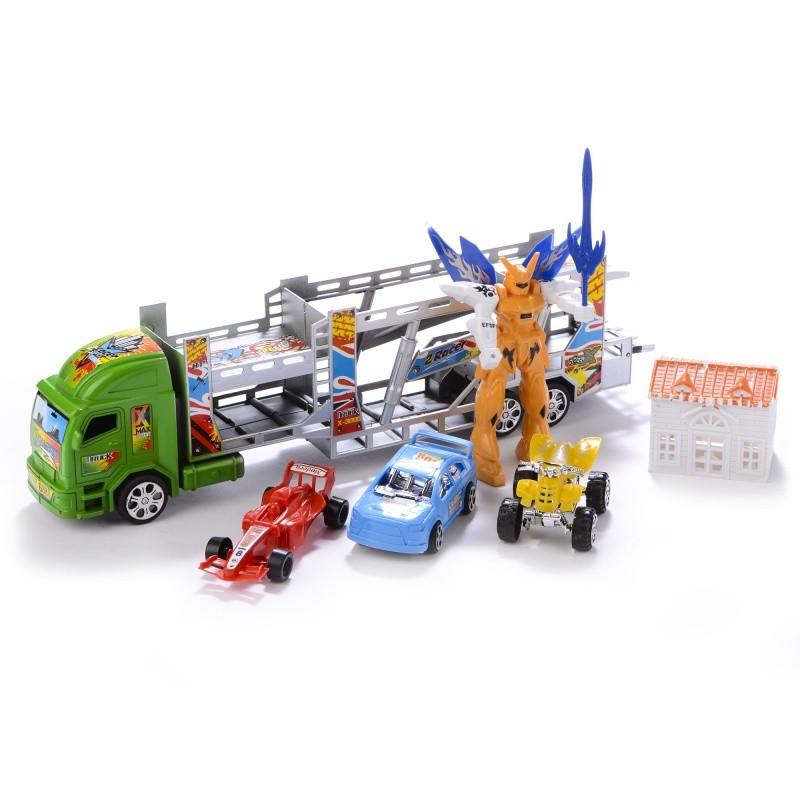 Відомий факт, що всі хлопці люблять грати з машинками. Зверніть увагу на цю іграшку, яка з першого погляду сподобається вашому малюкові. Крім вантажного автомобіля з трансформером в наборі ви побачите іграшковий будиночок, квадроцикл, спортивну і гоночну машинку. З такими складовими малеча зможе придумати багато цікавих ігор, влаштувати гоночні змагання, розіграти сюжети з фільмів про роботів і багато іншого. Такі іграшки не займуть багато місця у вашому будинку. Ця позиція в асортименті представлена різними варіаціями. Якщо вашій дитині буде нудно, вона може запросити своїх друзів приєднатися до неї в гру. Велика вантажівка працює на вбудованої інерційній системі. Будьте впевнені, що така іграшка не залишить байдужим нікого з вашої родини. Весь набір виготовлений з якісного і міцного пластику, безпечного для здоров'я дітвори. Рекомендується для гри дітям від 3 років. Комплектація: вантажівка - 1 шт; гоночна машинка - 1 шт; спортивна машинка - 1 шт; квадроцикл - 1 шт; трансформер - 1 шт; зброя - 1 шт; будинок - 1 шт. Тип живлення: Інерційний мехінізм