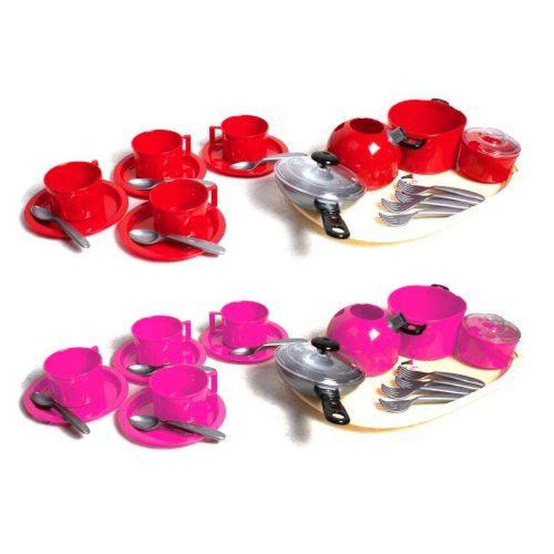 Набор яркой пластиковой посудки. В комплекте: поднос (31,5 х 21 см), кастрюлька с крышкой, сахарница с крышкой, сковородка, 4 тарелки, чайник, 4 чашечки, 4 вилки и 4 ложки._