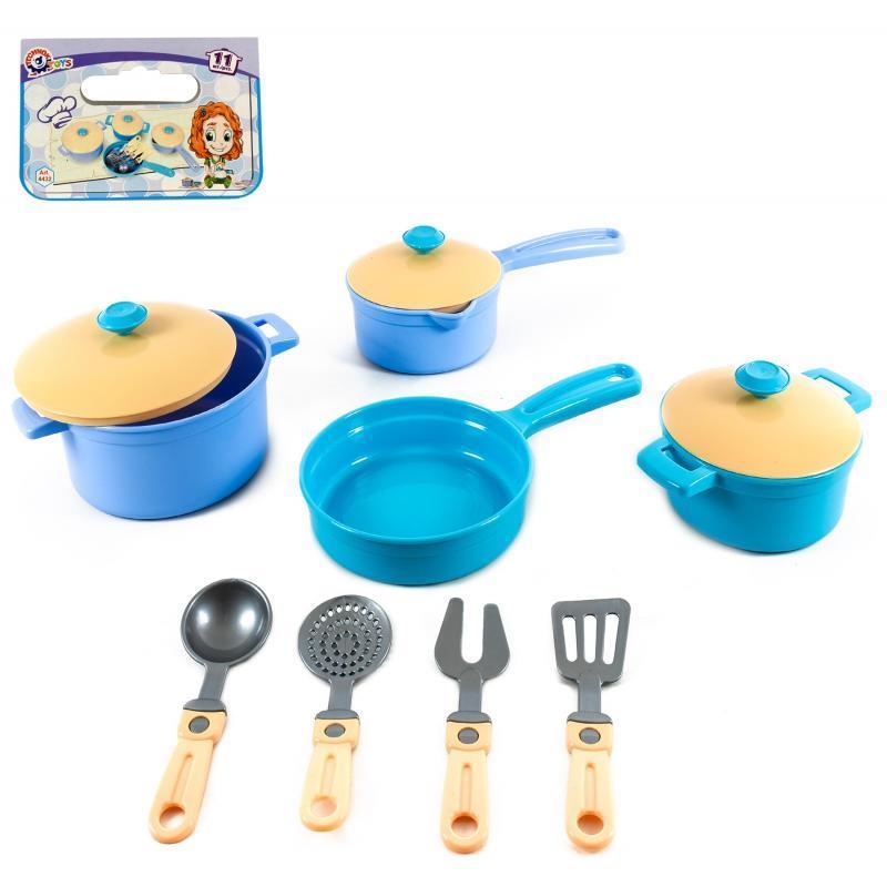 Іграшка "Набір посуду". Комплектація - 2 каструлі, сотейник з кришками, сковорідка, кухонне приладдя. Матеріал - пластик. Упаковка - пакет. Розмір - 40х12х23 см.