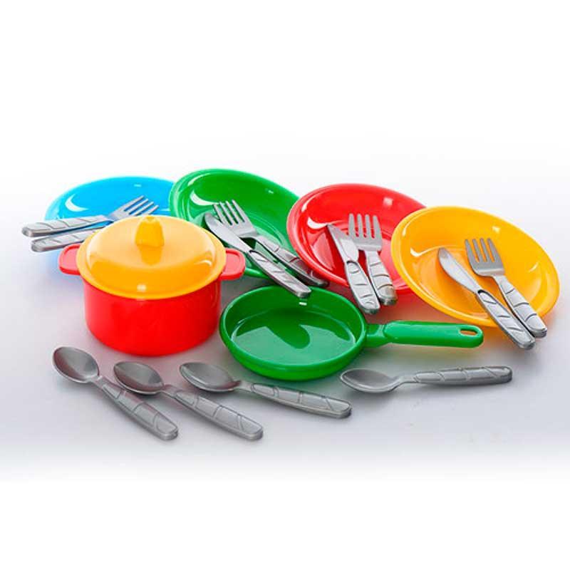 Разноцветная пластмассовая посуда упакована в пакет. Состоит из 19 предметов. Предназначена для детей от 3-х лет В набор входит: 1 сковорода, 1 кастрюля, 4 тарелки, 4 ложки, 4 вилки , 4 ножа. Производитель Украина Габаритные размеры 20?9?9 см Производитель может изменять цветовую гамму товара без предупреждения. Наличие цвета уточняйте у менеджера компании.