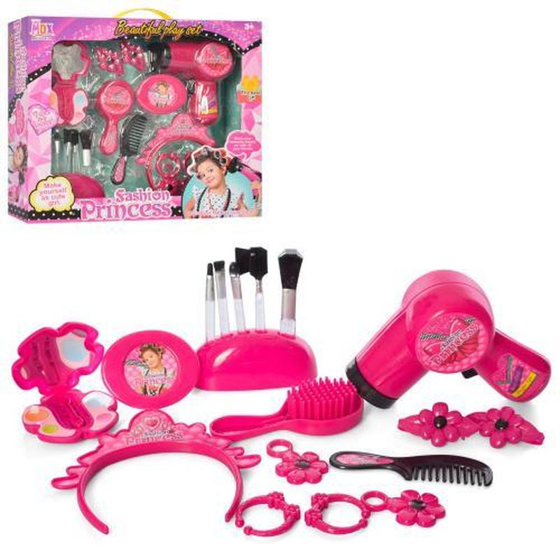 Набір аксесуарів "Перукар", 2 види. Комплектація - фен (дує повітрям), гребінець, аксесуари. Живлення - батарейки. Матеріал - пластик. Упаковка - коробка. Розмір - 34х8х30 см.
