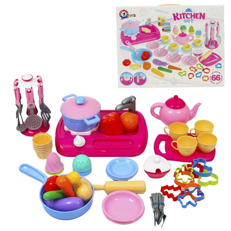 Іграшковий набір "Кухня", 66 предметів. Комплектаці - плита, раковина, різний посуд, столові прибори та кухонне приладдя. Матеріал - пластик. Упаковка - коробка. Розмір - 50х37,5х11 см.