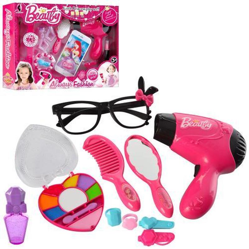 Набір аксесуарів для дівчинки, 2 види. Комплектація - фен, гребінець, косметика, шпилька. Матеріал - пластик. Упаковка - коробка. Розмір - 31х6,5х24,5 см.