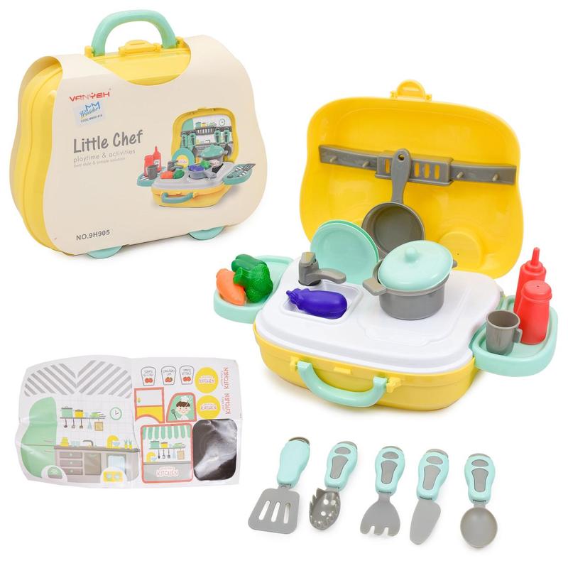 Набір кухонного приладдя. Комплектація - плита, стіл, посуд та продукти. Матеріал - пластик. Упаковка - валізка. Розмір - 23х25х10 см.