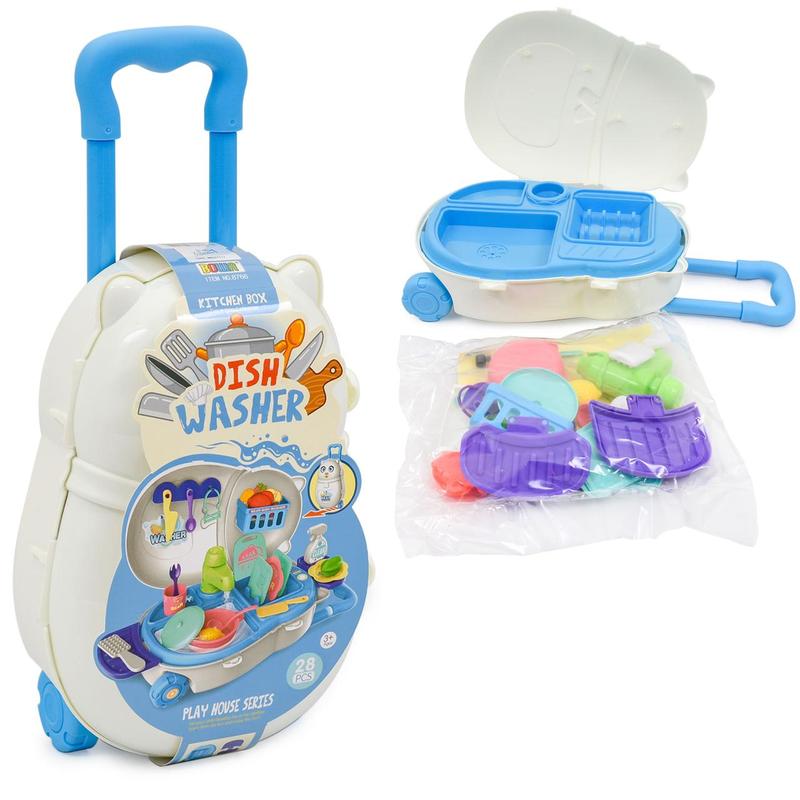 Іграшковий набір "Кухня". Комплектація - 28 предметів: мийка, посуд, столові прибори. Матеріал - пластик. Упаковка - валізка на колесах. Розмір - 37х20х10 см.