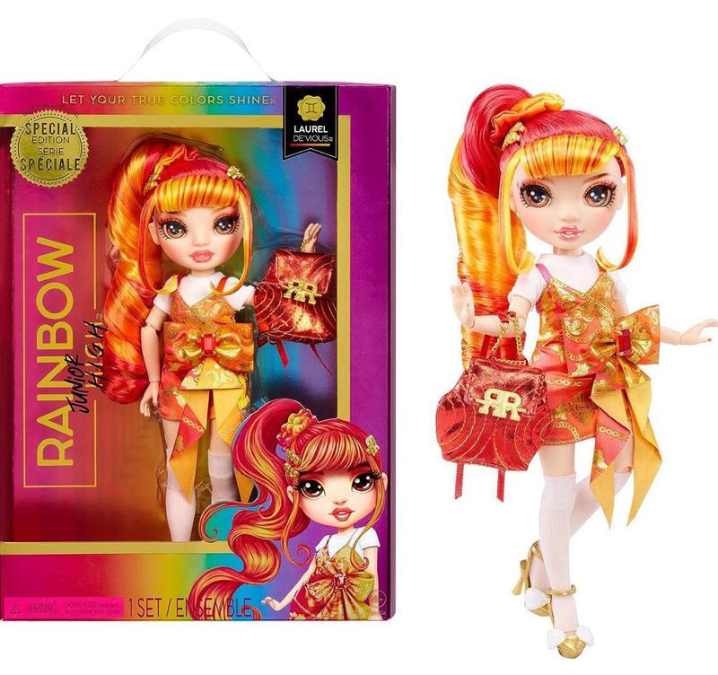 RAINBOW HIGH ВДЫХАЕТ НА ТВОРЧЕСТВО: вернитесь назад в прошлое и познакомьтесь со своими любимыми учениками до того, как они стали друзьями и последовали своим творческим мечтам в Rainbow High. В каждый тематический игровой набор входит полный кукольный наряд, кукла с новыми моделями лица для младшего возраста и мягкий виниловый рюкзак, чтобы носить необходимые вещи для школы. Этот игровой набор подарит детям нескончаемую радость и интересное развлечение. ПРЕКРАСНЫЕ ЧЕРТЫ: Лорел Де'Виус одета с головы до ног в красное и оранжевое. У нее прекрасная молодая скульптура лица, детализированные черты лица, красивый длинный красно-оранжевый хвост с челкой, длинные ресницы и стеклянные глаза. Собирайте и играйте со всеми веселыми и красивыми модными куклами Rainbow Junior High. JR ВЫСОКАЯ МОДА: Лорел всегда лучше одета в школе в своем красно-оранжевом атласном платье поверх короткой белой футболки с нейлоновыми носками и бело-золотыми каблуками. Трещина на пластике коробки
