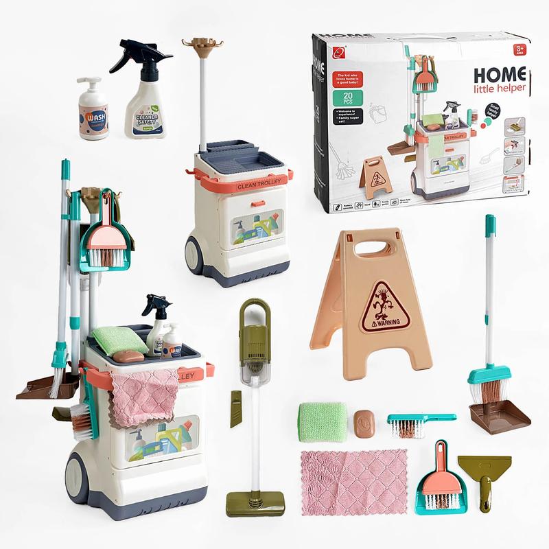 Цей цікавий набір містить все необхідне для справжнього прибирання, що дозволить дитині насолоджуватись грою протягом довгих годин. Малюк зможе допомагати батькам у повсякденних справах, засвоюючи важливі навички дисципліни та догляду за домом. Реалістичний дизайн та різноманітність елементів дозволяють дитині відчути себе незамінним помічником! Особливості: - набір містить 20 елементів; - відмінно підійде для навчання чистоті; - дитина зможе допомагати батькам у повсякденних справах; - різноманіття елементів; - пилосос працює від 3-х батарейок типу "АА" (не додаються); - пилосос відтворює потік повітря. Комплектація: - візок для прибирання; - знак «обережно, слизька підлога»; - маленькі щітки; - ганчірка; - мітла та совок; - пилосос; - великий совок; - мило; - розпилювач.