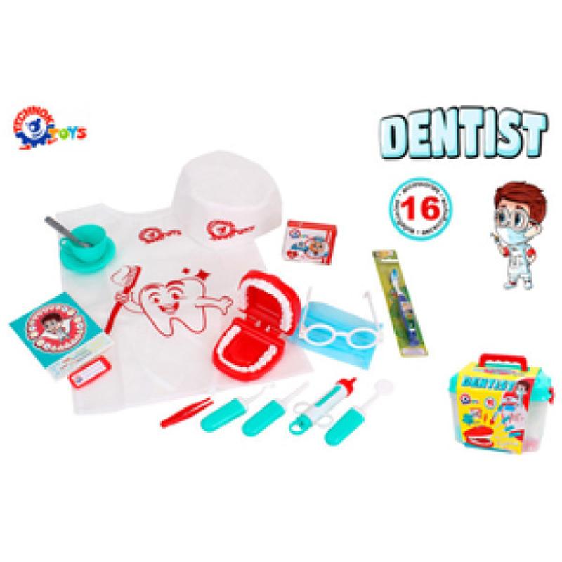 Игровой набор Стоматолог технок Техн.7365 < Игровой набор Стоматолог - как научить детишек правильно чистить зубки? Это действительно ответственная и важная задача для всех родителей. А для всех малышей подарок – настоящая детская зубная щетка. Теперь мальчики и девочки с увлечением будут учиться ухаживать за своими зубками и лечить их любимым игрушкам. А соблюдать все правила гигиены в стоматологическом кабинете поможет специальная накидка врача с интересным принтом, шапочка и, главное, защитная маска. Так малыш точно почувствует себя настоящим врачом. В наборе профессиональные стоматологические инструменты бур, зеркало и зонд, а также шприц, пинцет, очки, бейдж, коробочка с пилюлями, нумерация зубов и чашка с ложечкой на тарелочке. И конечно, самое интересное – модель челюсти. Теперь все зубки можно тщательно осмотреть и хорошо полечить. Набор стоматолога поможет детям научиться ухаживать за своими зубками и преодолеть страх перед посещением стоматологического кабинета. Набор станет отличным подарком для каждого малыша. Игрушка изготовлена из прочного качественного пластика без запаха. Для детей от 3 лет. В комплекте бонус – детская зубная щетка. Упаковка – удобный саквояж с ручкой и замками. Производитель может изменять цветовую гамму товара без уведомления. Наличие цветов уточняйте у менеджера компании. Можете купить уже сегодня!